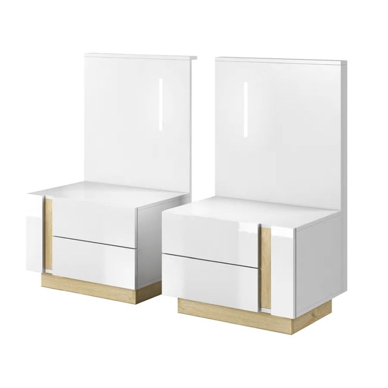 Elegantná sada dvoch nočných stolíkov v modernom prevedení s kombináciou bielej, dubu grandson a bieleho lesku dodá vašej spálni štýlový a čistý vzhľad. Dvierka bez úchytiek s dotykovým systémom PUSH UP a LED osvetlenie zvyšujú funkčnosť aj estetiku