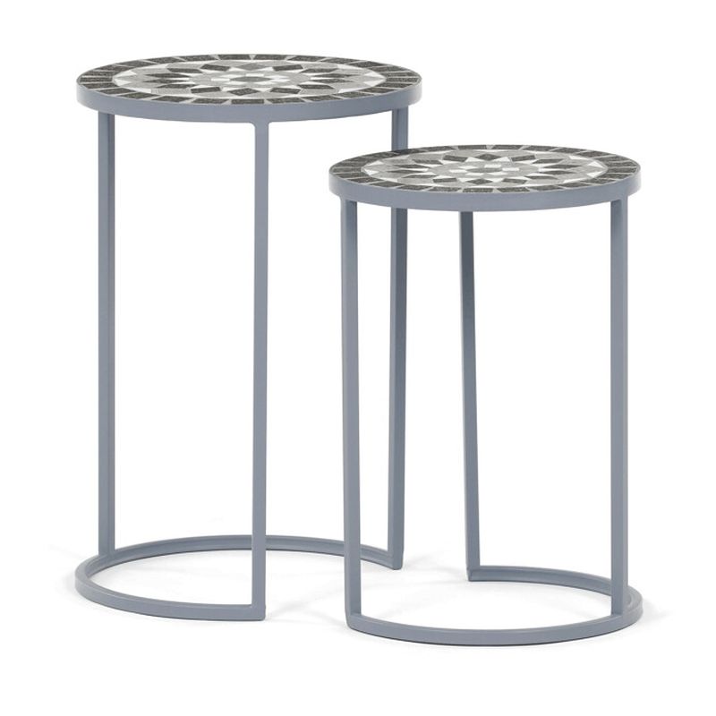 Vrchné okrúhle dosky z keramiky zdobí geometrický mozaikový vzor v prírodných sivých a bielych odtieňoch, ktorý dodáva stojanom originálny vizuálny efekt. Stabilná kovová podnož s oblúkovým rámom pôsobí ľahko a vzdušne, pričom zabezpečuje vysokú stabilitu.