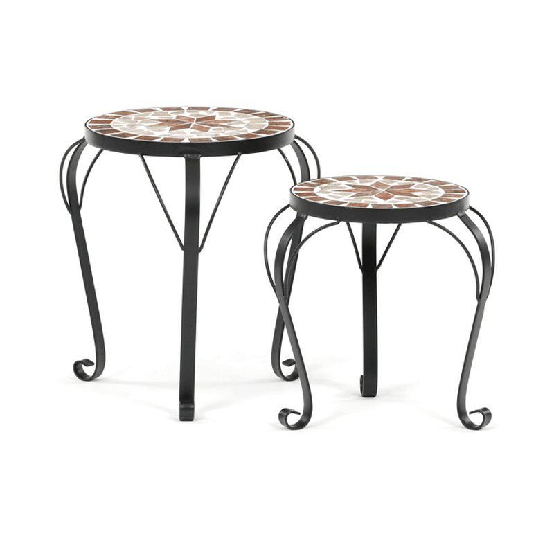 Dekoratívna sada stojanov na kvety v elegantnom béžovom prevedení je ideálnym doplnkom do interiéru, na terasu, balkón alebo do zimnej záhrady. Spojenie pevnej kovovej konštrukcie a dekoratívnej keramickej mozaiky vytvára štýlový prvok, ktorý krásne zvýrazní kvety, rastliny alebo dekorácie.