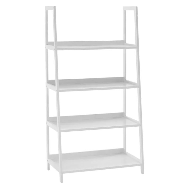 Moderný regál z MDF a lakovaného bambusu v univerzálnej bielej farbe. Vďaka štyrom policám rôznej hĺbky poskytuje praktický úložný priestor do kúpeľne, predsiene alebo pracovne