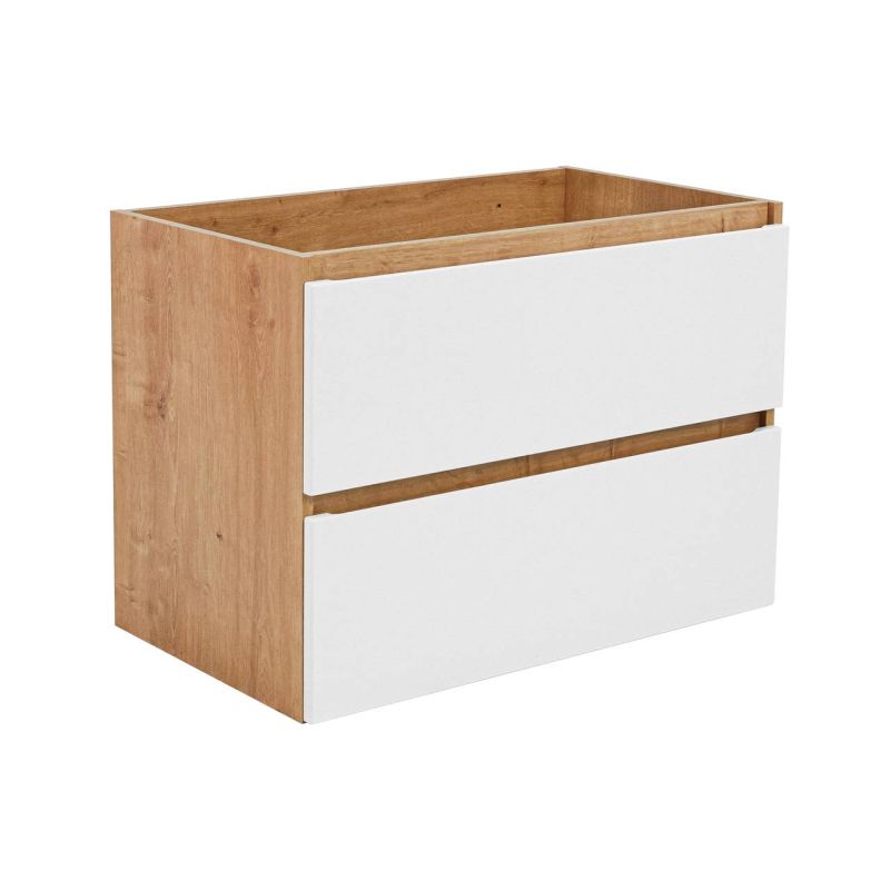 Štýlová kúpeľňová skrinka s dvomi zásuvkami, ktoré sú vybavené tichým dojazdom pre pohodlné a tiché uzatváranie. Cena neobsahuje vrchnú dosku, ktorá si môžete zakúpiť zvlášť. Skrinka je dodávaná v demonte a je ideálnym doplnkom do modernej kúpeľne, kde sa kombinuje dubový dekor s bielymi prvkami.