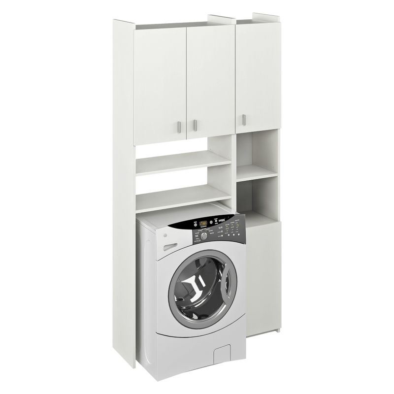 Otvorený priestor je určený pre práčku s maximálnymi rozmermi 60,8x85 cm. Nad ním sa nachádza dvojdverová skrinka predelená policou na dve časti, zatiaľ čo regál obsahuje dve skrinky v hornej a dolnej časti a otvorený úložný priestor v strede. Regál je univerzálny a môžete ho umiestniť na pravú alebo ľavú stranu. Skrinka je postavená na klzákoch a manipuláciu s dvierkami uľahčujú plastové úchytky.