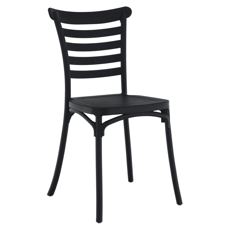 Praktická a moderná stolička, ideálna do interiéru aj exteriéru. Vyrobená z plastu v čiernej farbe, táto stolička skvelo zapadne do jedálne, na terasu, záhradu, balkón alebo na firemné akcie. Funkcia stohovateľnosti umožňuje jednoduché a praktické ukladanie viacerých stoličiek