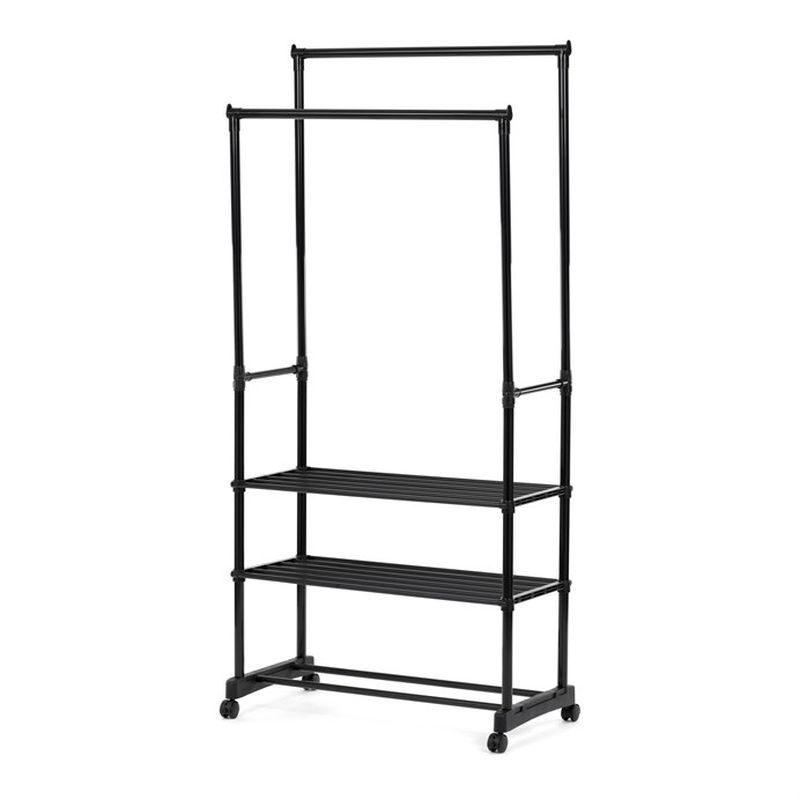 Stojan je vybavený dvoma tyčami na zavesenie odevov, čo poskytuje dostatok priestoru pre vaše šaty, kabáty, alebo iné oblečenie. Tri spodné police sú ideálne na uloženie topánok, tašiek, krabíc alebo doplnkov, čo vám pomôže udržať poriadok.