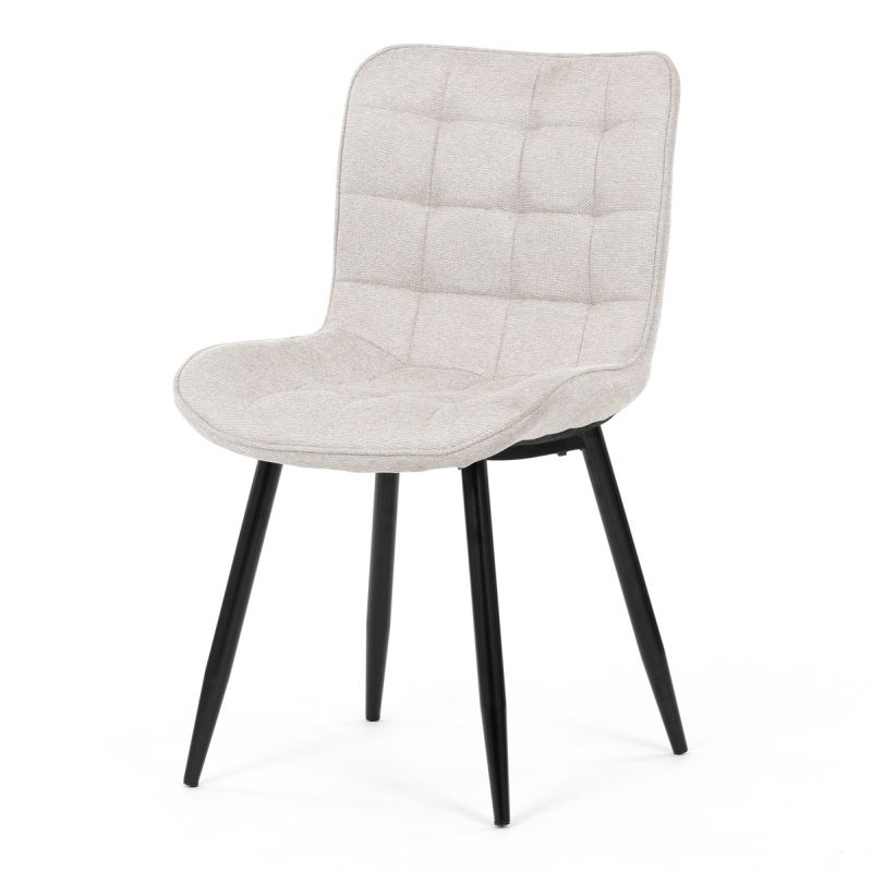 Táto moderná jedálenská stolička je potiahnutá béžovou látkou, ktorá je nielen príjemná na dotyk, ale aj esteticky príťažlivá. Dizajnové prešitie dodáva stoličke elegantný vzhľad, zatiaľ čo tvarovanie kostry a poctivé polstrovanie zabezpečujú maximálne pohodlie. Kovové nohy v matnej čiernej farbe sú stabilné a podnož je vybavená čiernymi plastovými klzákmi, ktoré chránia podlahu.