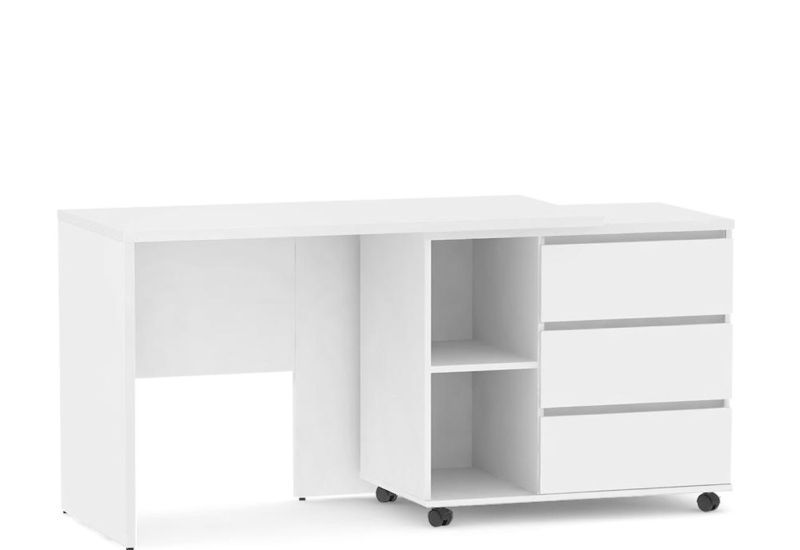 Elegantný písací stôl pravý s otočným kontajnerom na kolieskach, tromi zásuvkami a otvorenými policami. Vďaka pravostrannému prevedeniu a bezúchytkovému dizajnu sa skvele hodí do študentskej izby, detskej izby aj domácej kancelárie.