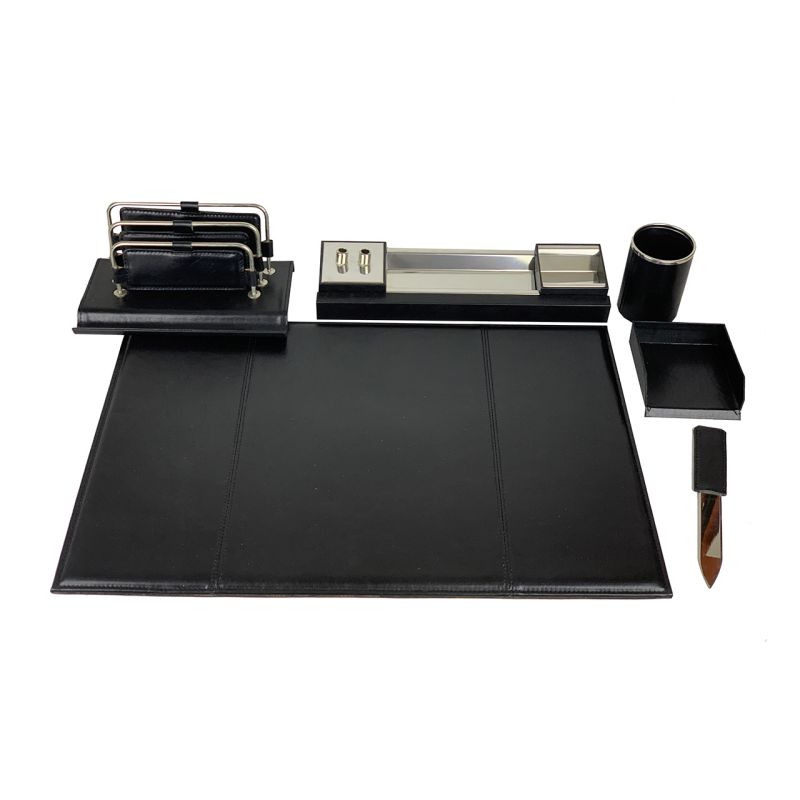 Tento naozajstný kancelársky set spĺňa všetky kritériá pre skvele použiteľný produkt a je vyrobený z prírodnej kože v hlboko čiernej farbe, ktorá sa spája so strieborným kovaním, čím vytvára dokonalú harmóniu luxusu a elegancie.