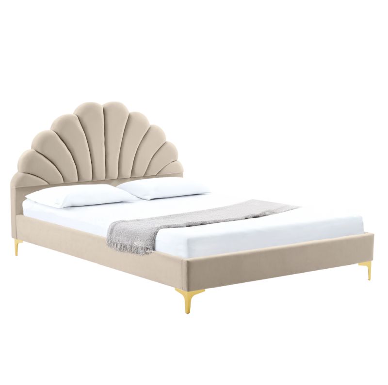 Luxusná posteľ v elegantnej béžovej Velvet látke, ktorá vniesie do vašej spálne nádych glamour štýlu a pohodlia. Vysoké prešívané čelo v tvare mušle zaujme svojím jedinečným dizajnom a poskytuje pohodlnú oporu pri čítaní či relaxácii. Zlaté kovové nožičky podčiarkujú moderný a luxusný vzhľad