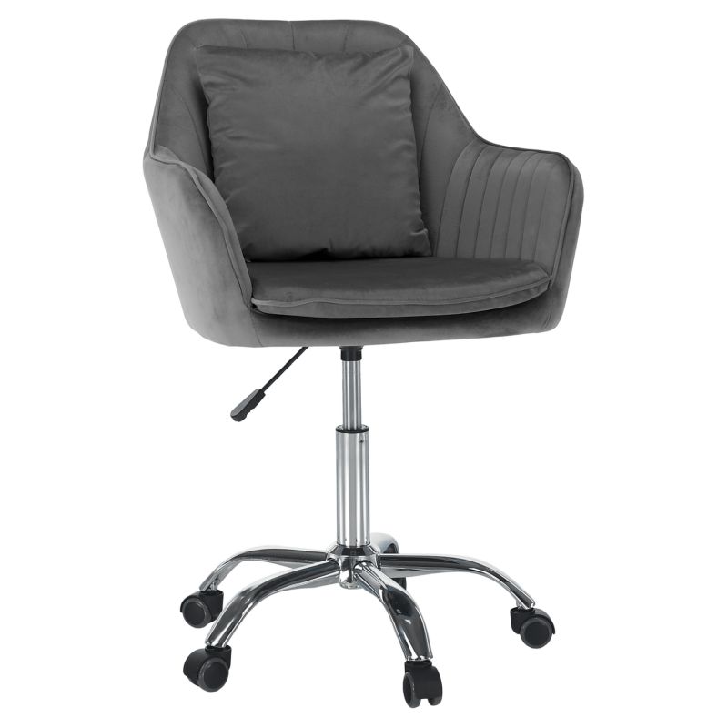 Elegantné kancelárske kreslo čalúnené jemnou zamatovou látkou Velvet v sivom odtieni dodá vášmu pracovnému priestoru moderný a útulný vzhľad. Chrómová podstava s kolieskami zabezpečí stabilitu a jednoduchú manipuláciu. Praktický vankúš sedadla poskytne extra pohodlie