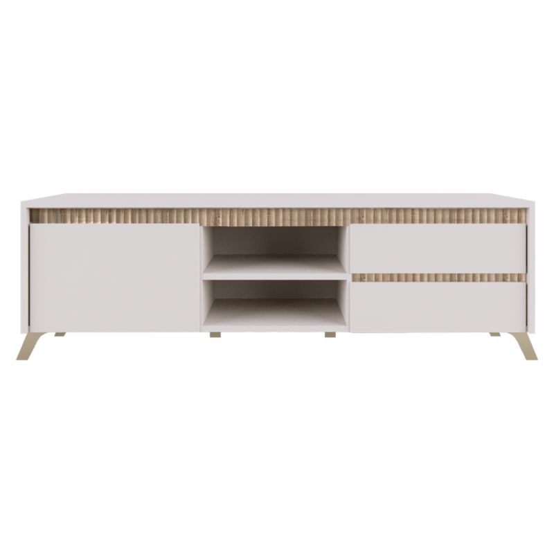 TV stolík zaujme svojím minimalistickým vzhľadom bez úchytiek, ktorý je dosiahnutý vďaka praktickému skrytému zrezaniu čiel. Tento detail podčiarkuje čisté línie a moderný charakter nábytku.