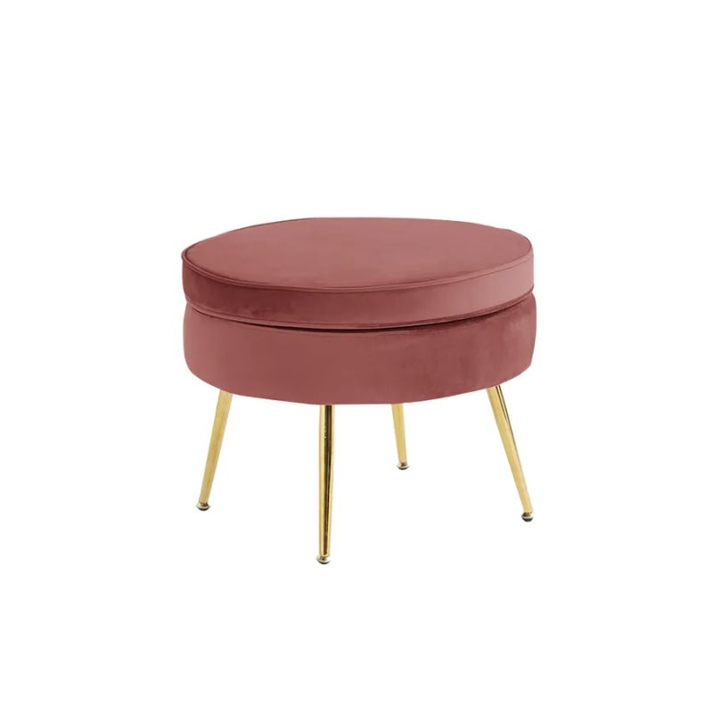 Luxusný taburet s okrúhlym tvarom, ktorý spája jemnú ružovú velvet látku so zlatými kovovými nohami v štýle Art-deco. Elegantný a decentný dizajn vytvára pôvabný a noblesný vzhľad. Štíhle nohy sú vybavené ohybnými klzákmi, ktoré vyrovnávajú nerovnosti podlahy a zabezpečujú stabilné sedenie na rôznych povrchoch