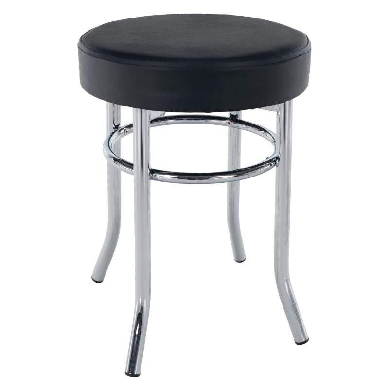 Taburetka, ktorá skvelo nahradí jedálenskú stoličku. Stabilná a pevná konštrukcia z kovu v chrómovom prevedení s nosnosťou 100 kg. Sedacia časť je čalúnená čiernou ekokožou s vysokou odolnosťou. Vhodná do moderných, klasických aj minimalistických interiérov