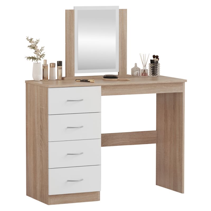Zrkadlo je pevnou súčasťou stolíka a zvyšuje komfort pri každodennom používaní. Kombinácia bielej farby a dekoru dub sonoma pôsobí moderne, no zároveň príjemne a útulne, takže sa ľahko začlení do rôznych typov interiérov.