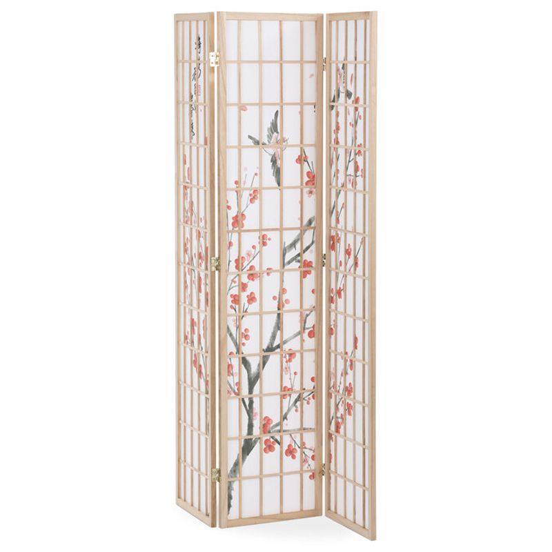 Trojpanelový paraván z masívneho smreka v prírodnom odtieni ponúka ľahkú a vzdušnú prepážku s bielou netkanou textíliou, ktorá je zdobená jemným motívom vetiev, kvetov a vtákov v čiernych a červených tónoch. Pevné drevené rámy zaisťujú stabilitu a zároveň umožňujú jednoduché skladanie a premiestnenie podľa potreby.