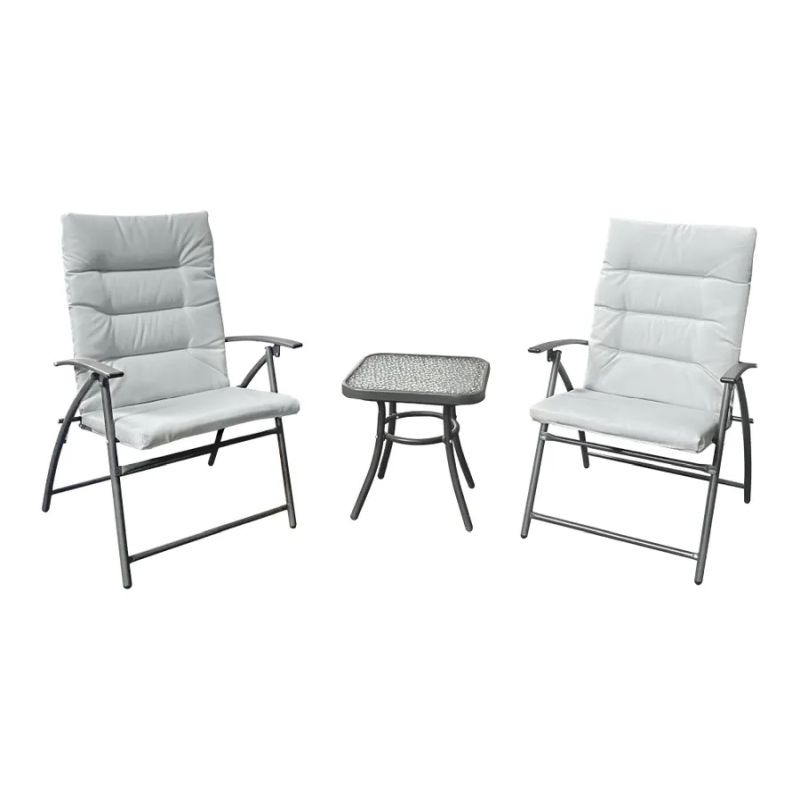 Luxusný záhradný set so svetlosivými kreslami a tmavosivým kovovým rámom zabezpečí pohodlie a štýl na vašej záhrade či terase. Kreslá sú doplnené vodeodolnými vankúšmi s hrúbkou 3 cm. Konferenčný stolík má tvrdené sklo a stabilnú konštrukciu