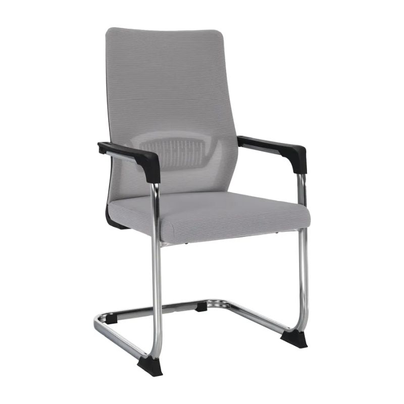 Praktická zasadacia stolička so sivou sieťovinou a čiernymi podrúčkami je ideálna do kancelárií či rokovacích miestností. Stabilná kovová konštrukcia v chrómovom prevedení a ergonomická opierka na chrbát zabezpečia pohodlie aj pri dlhšom sedení