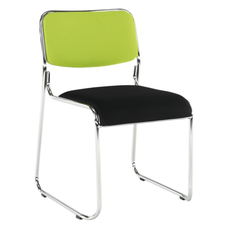Elegantná zasadacia stolička s kombináciou zelenej a čiernej sieťoviny, ktorá ponúka pohodlné a štýlové sedenie. Vďaka kvalitným kovovým nohám a možnosti stohovania je praktická a ľahko uskladniteľná, čo ju robí ideálnou pre rôzne pracovné a zasadacie miestnosti